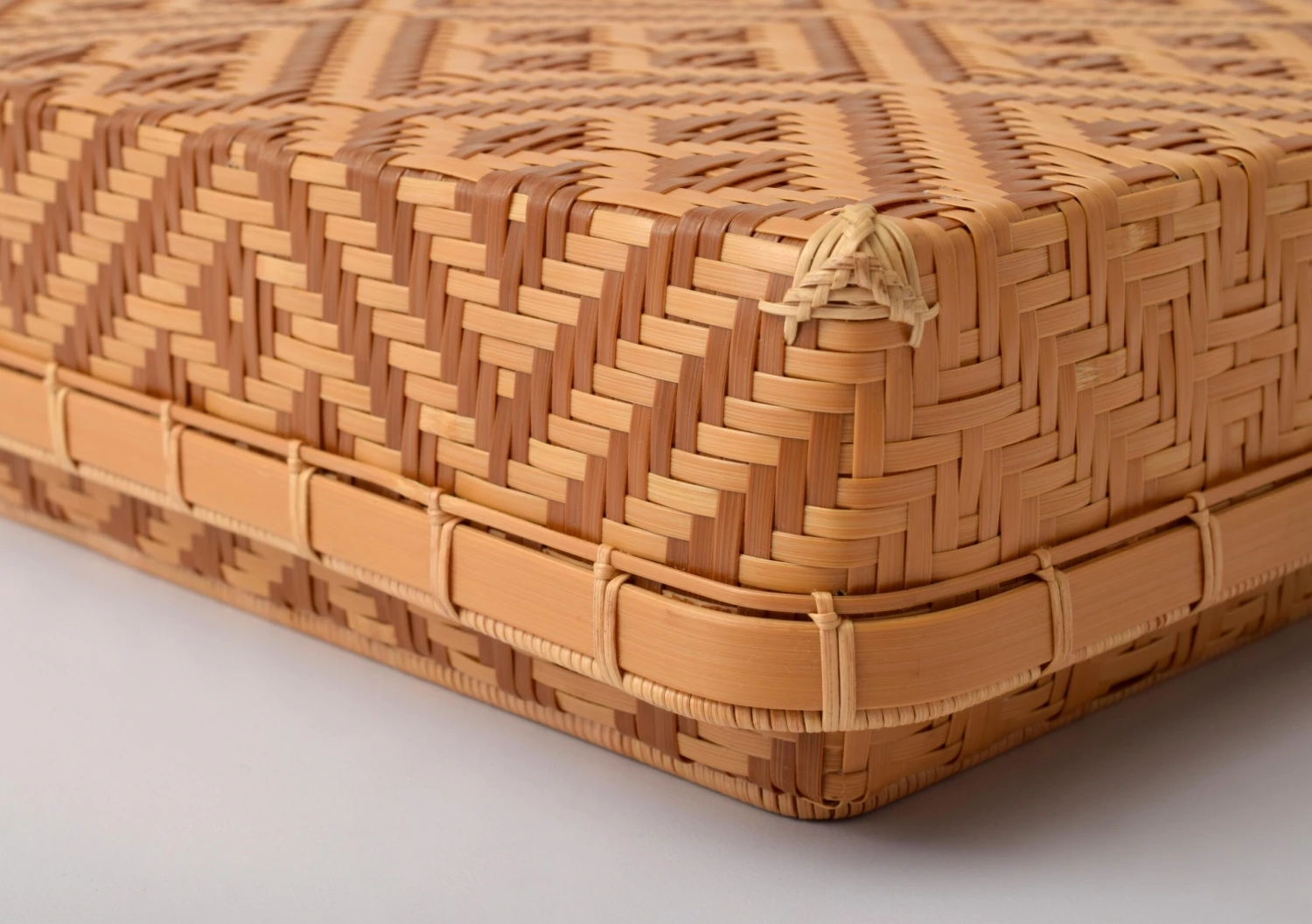 Country of origin; materials: Japan; Madake bamboo, rattan, brocade silk (interior lining of box)