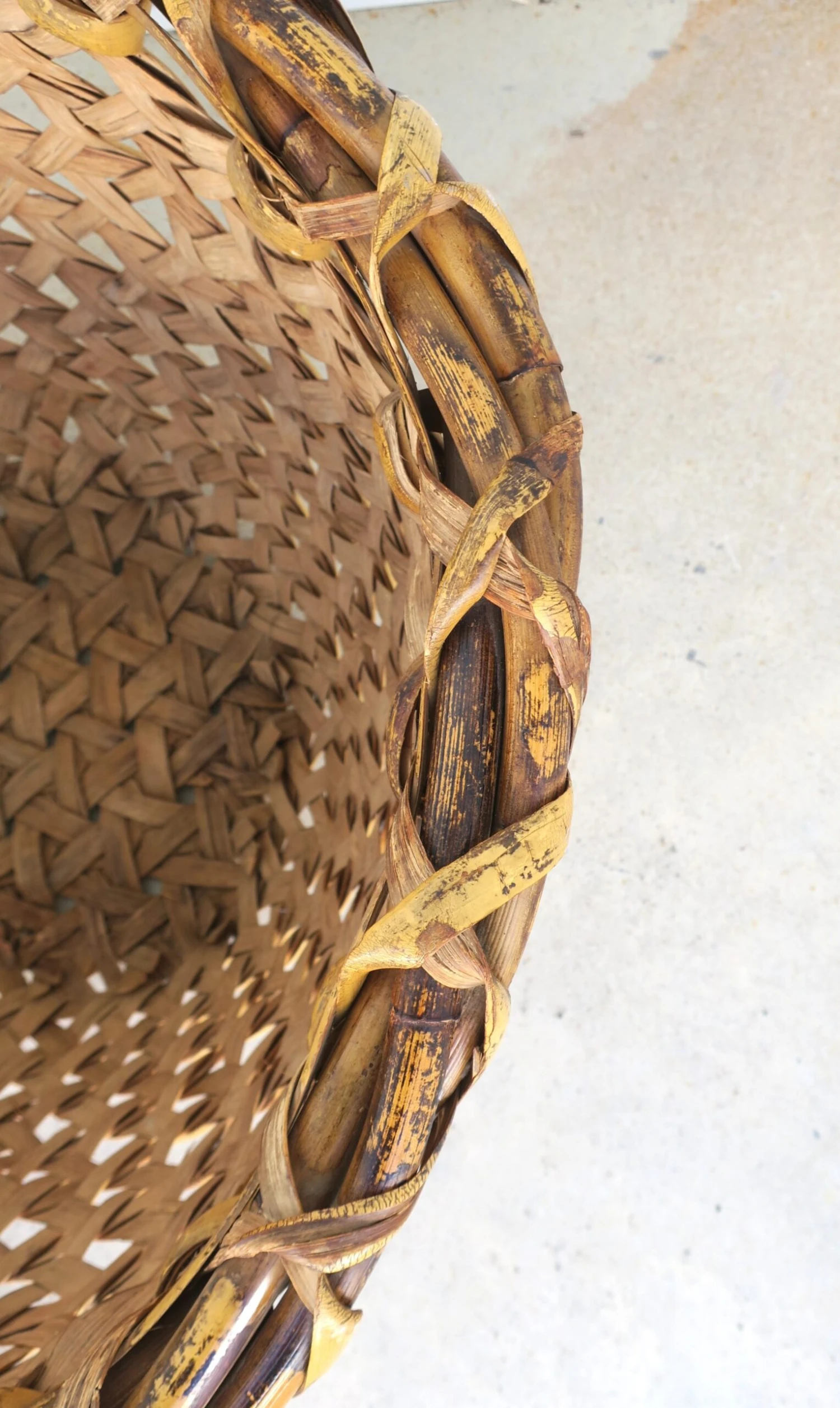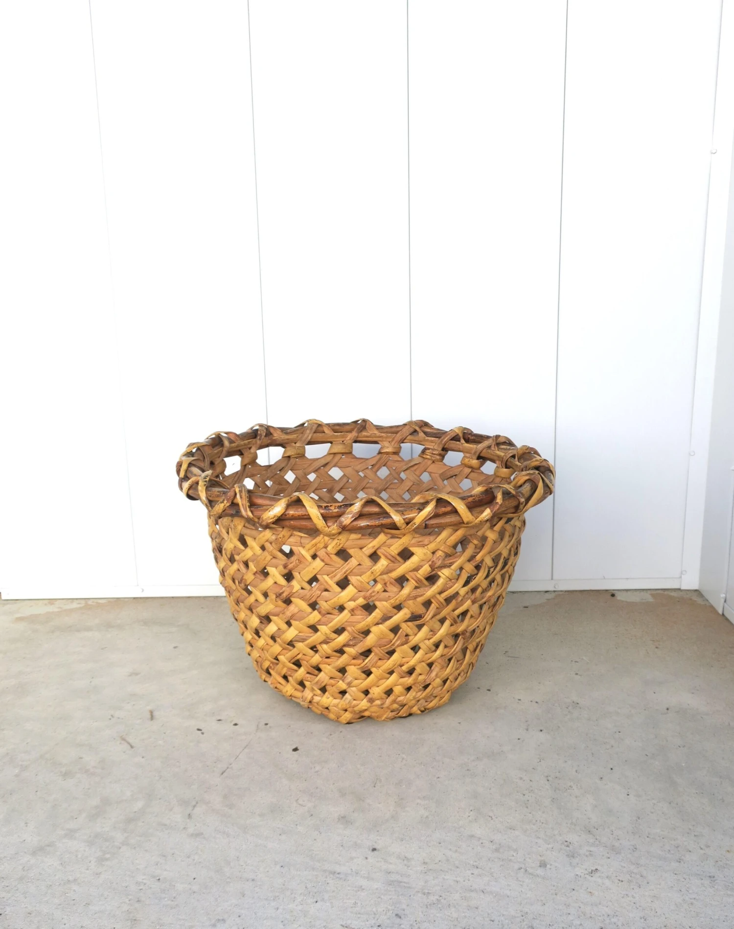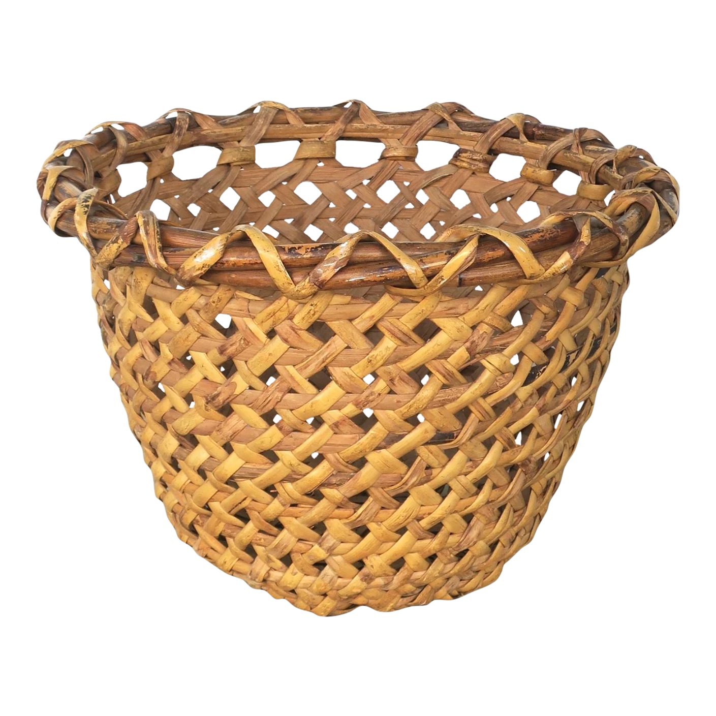 A hand-woven vintage wicker basket, circa mid-20th century, 1960s – 1970s.