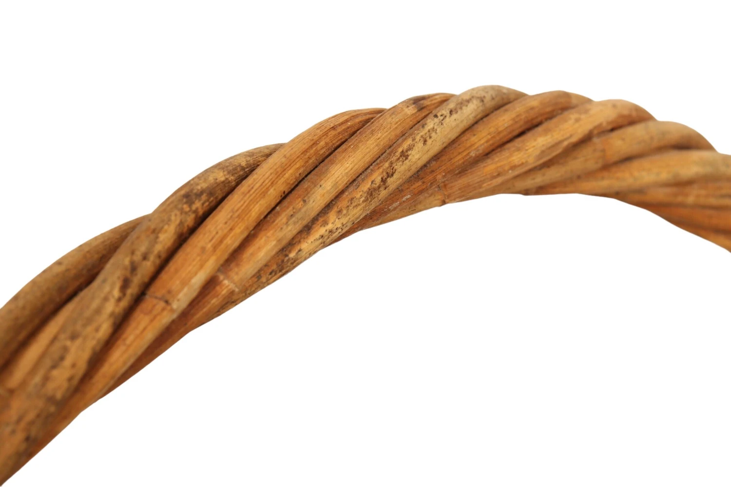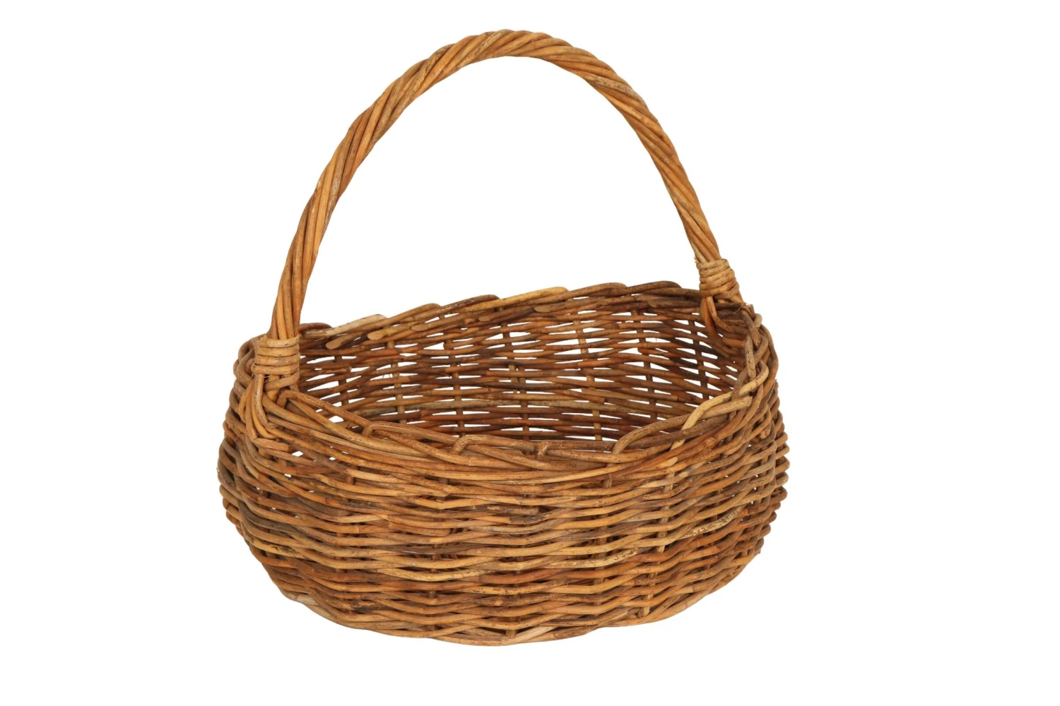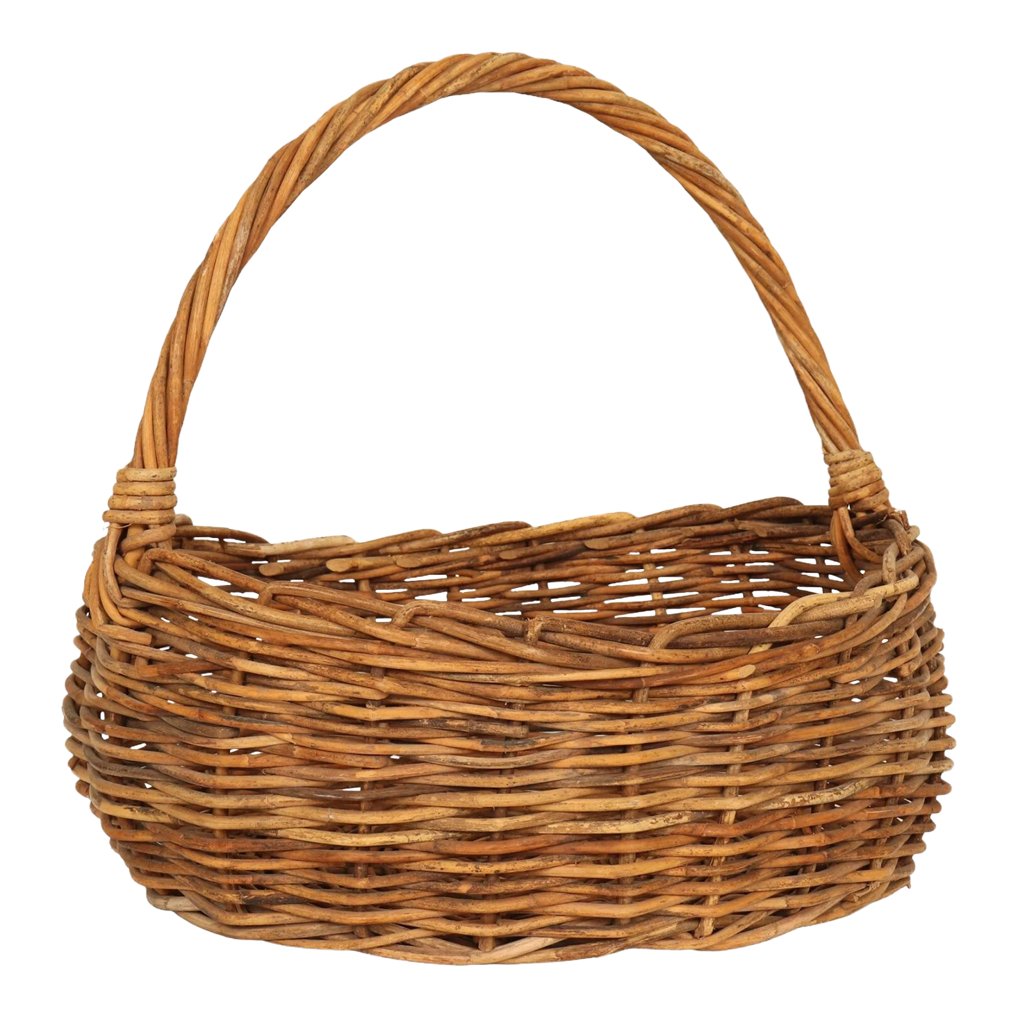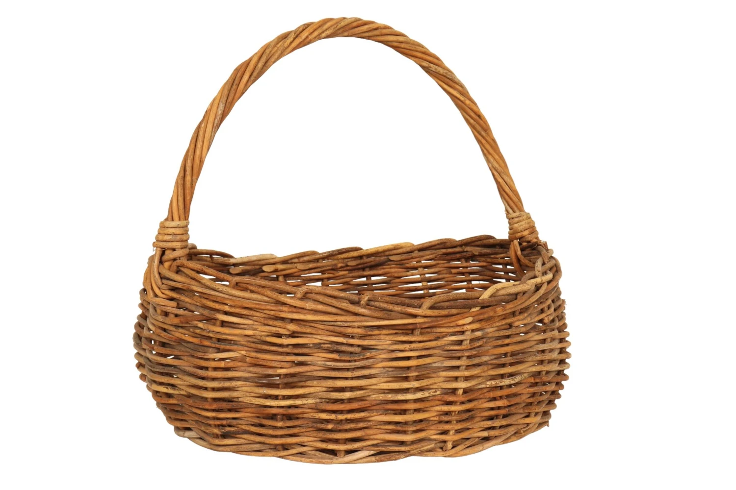 A classic French style oval shopping basket made of woven wicker. An arch like handle is made with twisted wicker …